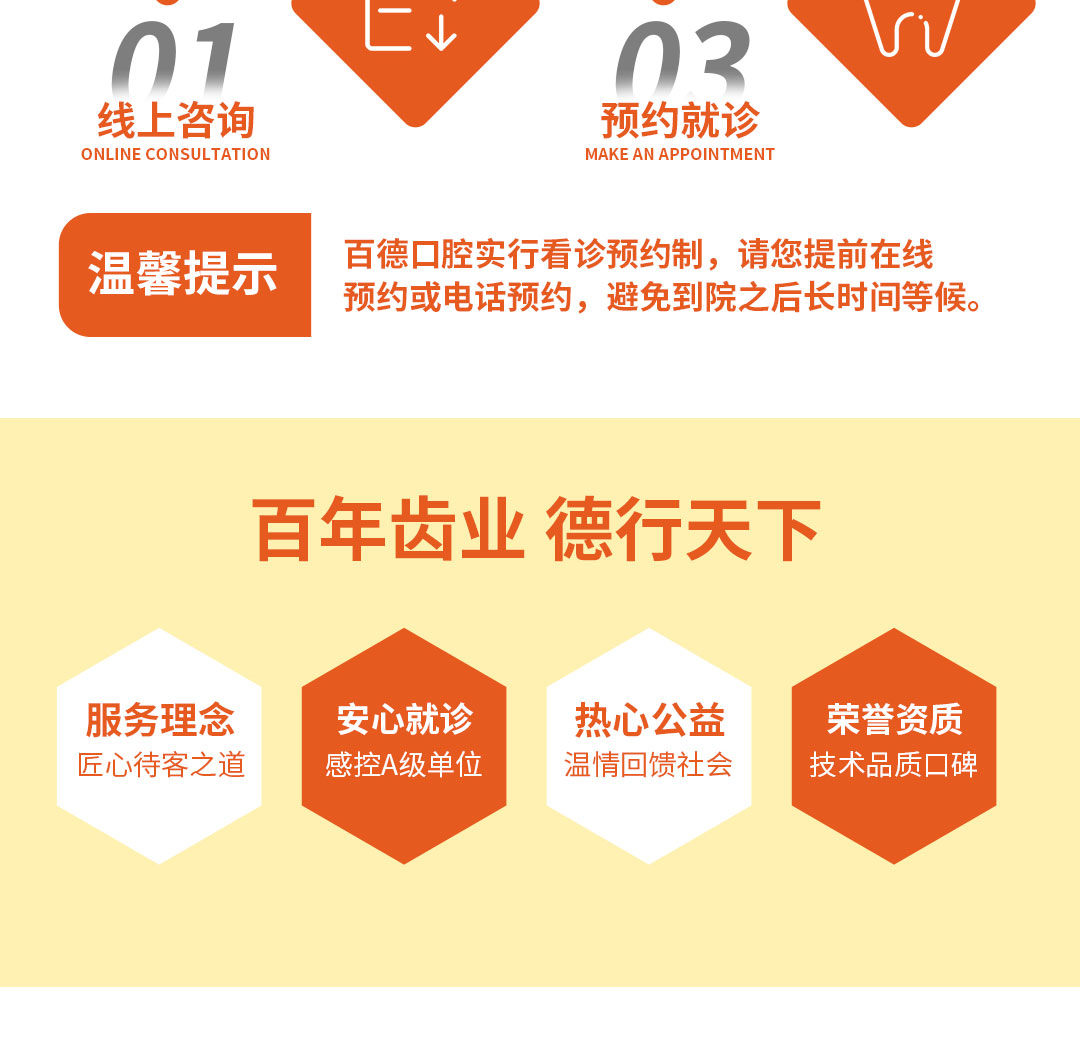 服务理念:“百年齿业,德行天下”为百德口腔办院宗旨,崇尚医德回归医疗本质。