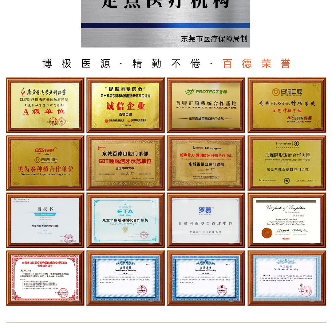 “百年齿业,德行天下”为百德口腔办院宗旨。崇尚医德回归医疗本质,为东莞市民提供优质的口腔健康服务,业务包括:牙齿种植、口腔正畸、牙周、儿童齿科、综合治疗等。先后引进了一大批先进的医疗设备和诊疗系统,并成立权威医师团队,为百德医疗质控提供了坚强的保障。