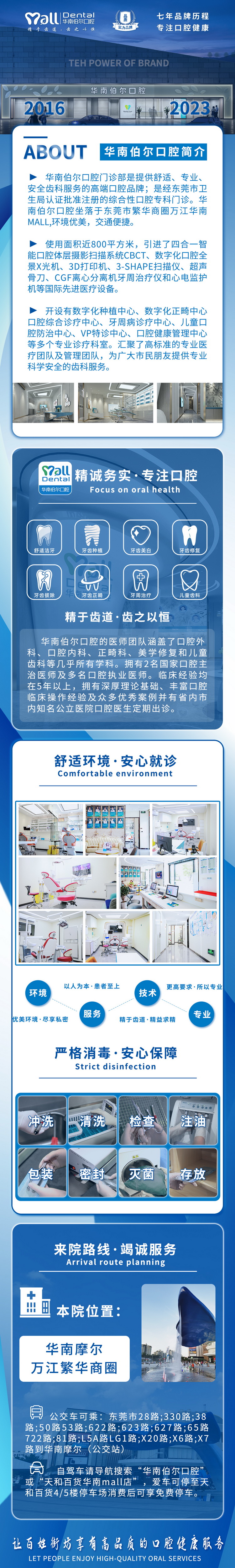 华南伯尔口腔门诊部是提供舒适、专业、安全齿科服务的高端口腔品牌; 是经东莞市卫生局认证批准注册的综合性口腔专科门诊。华南伯尔口腔坐落于东莞市繁华商圈万江华南MALL,环境优美,交通便捷。